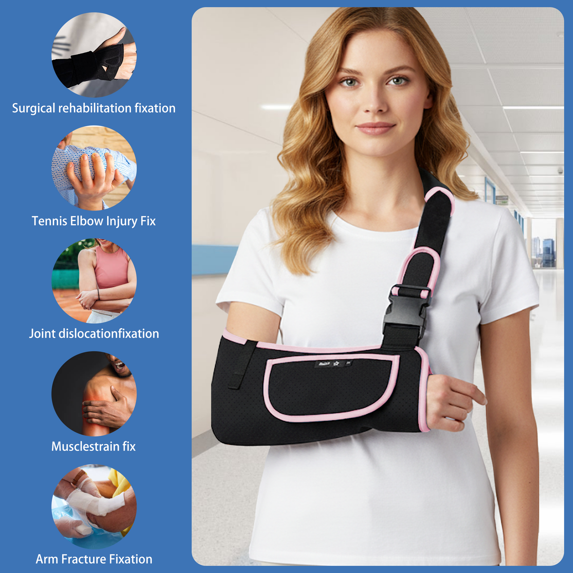 Adjustable arm sling designed to provide comfortable support for shoulder, arm, wrist, and elbow. Features breathable material and secure straps.